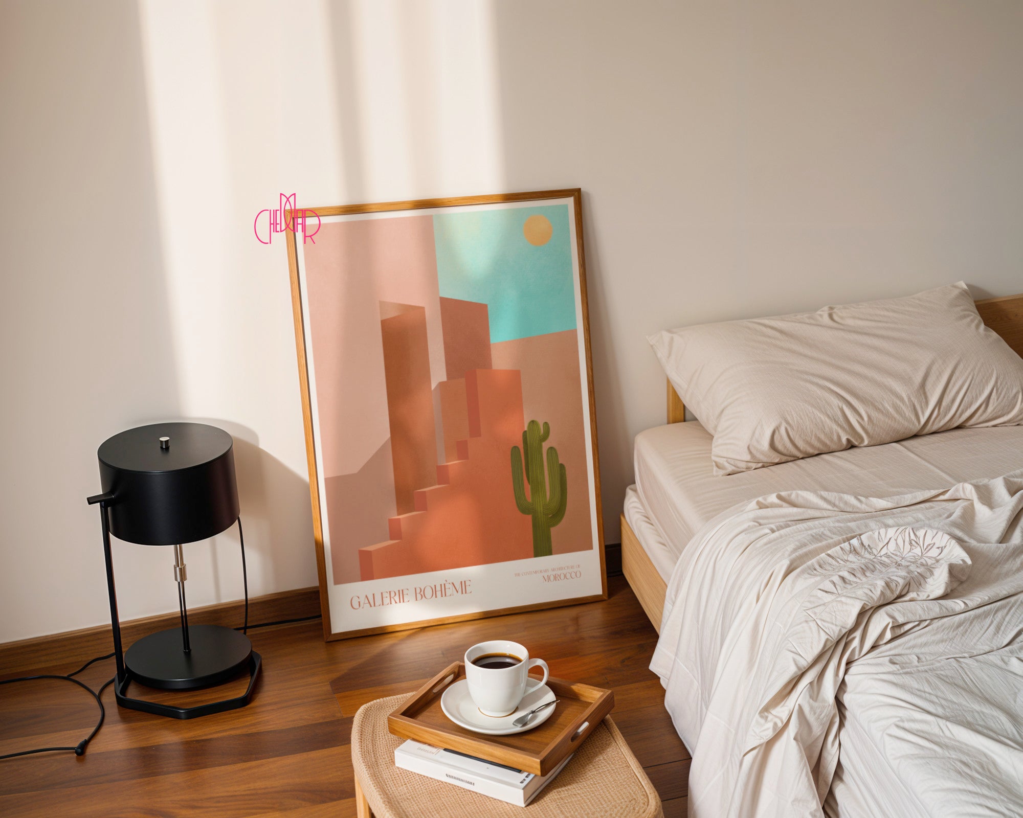 Wzbogać swoją kolekcję o poster, który jest esencją współczesnego minimalizmu. „Morocco Shadows” to artystyczna interpretacja pustynnego krajobrazu, gdzie monumentalne, terakotowe formy schodów i ścian przecinają się pod idealnym kątem. Smukły kaktus na tle błękitnego nieba i delikatne, złote słońce dopełniają tę harmonijną kompozycję, tworząc obraz pełen spokoju i klasy.