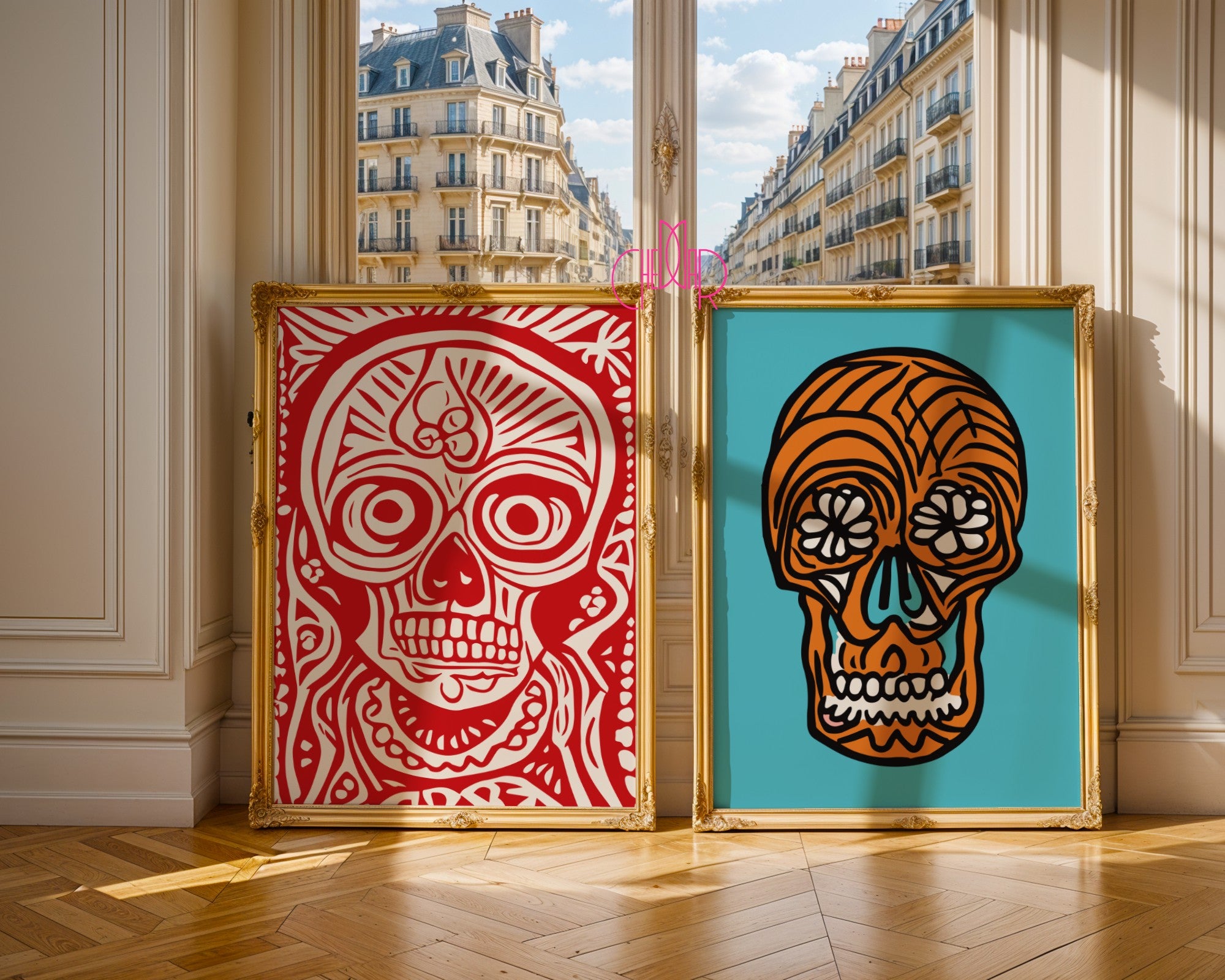 Add a unique touch to your interior with this Mexican-inspired "Día de los Muertos Skulls" poster. It's the perfect decoration for lovers of bold colors, folklore, and the symbolism of the Mexican Day of the Dead. Inspired by the aesthetics of Día de los Muertos and the spirit of the fairy tale Coco , these expressive skulls will bring energy, character, and an artistic atmosphere to your space. It's perfect for living rooms, bedrooms, offices, art studios, cafes, restaurants, and creative spaces.